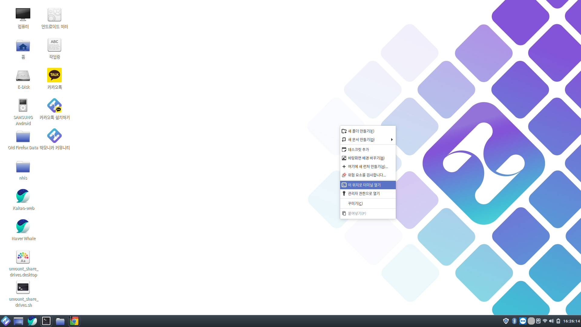 바탕화면에서 마우스 '우클릭 > 이 위치로 터미널 열기'를 실행합니다.