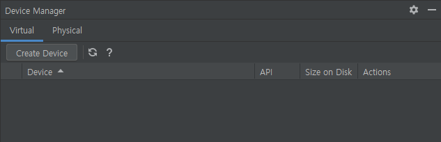 Device Manager 에서 Virtual 탭의 Create Device 를 클릭 실행한다.