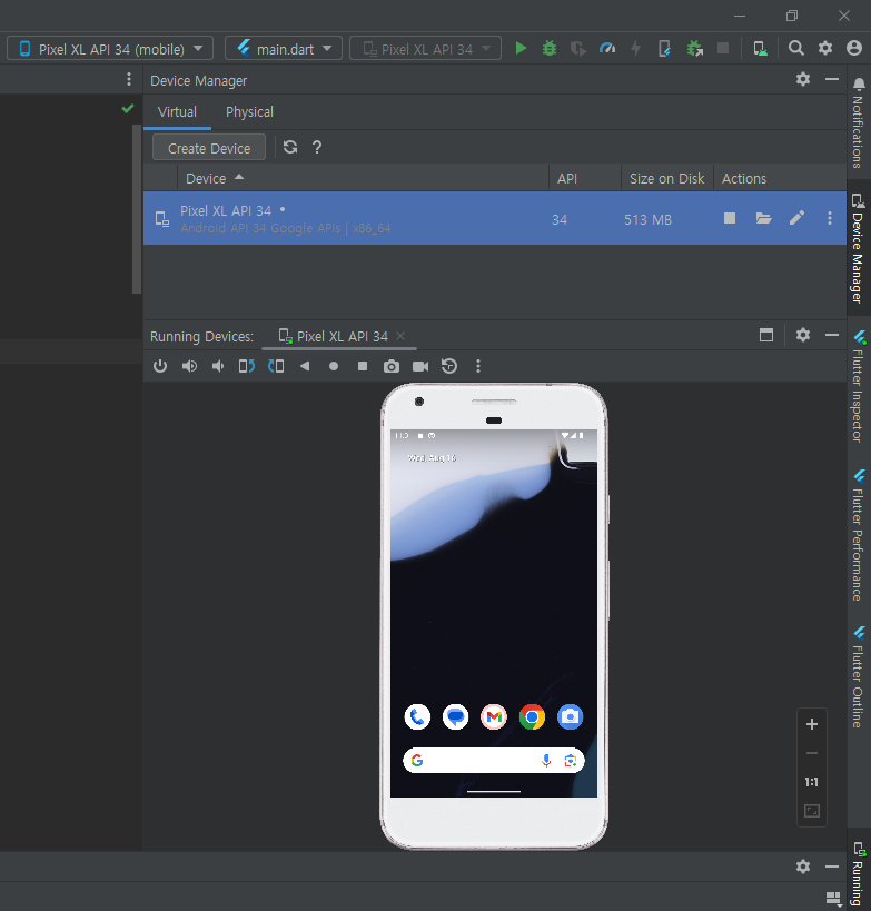 Virtual 목록에서 생성한 AVD 항목을 확인할 수 있다.