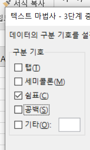 2단계에서 위와 같이 "쉼표" 를 체크한 후 "마침" 버튼을 클릭 실행합니다.