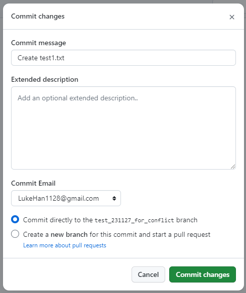 위와 같이 commit 메시지 설정 창이 나타나면 메시지 및 내용을 추가한 후 하단의 Commit changes 를 클릭 실행하여 반영한다.