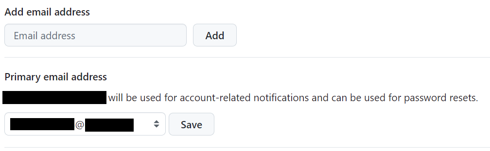 만약 메인으로 사용할 메일을 변경해야 하는 경우 Primary email address 항목에서 등록된 메일 중 사용할 메일을 선택한 후 Save 버튼을 클릭 실행하여 저장한다.