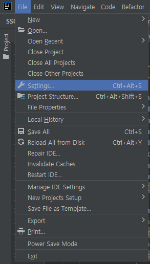 좌측 상단 메뉴 File > Settings 를 클릭 실행한다.