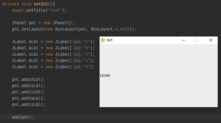 JAVA swing 은 HTML/CSS 와 달리 먼저 추가된 항목이 앞으로 나오도록 되어 있습니다.