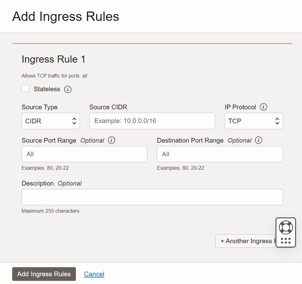 Ingress Rules 항목 상단의 Add Ingress Rules 버튼을 클릭 실행한다.