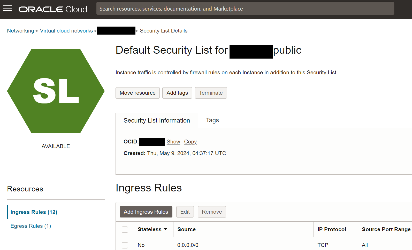 위와 같이 Security Lists 의 항목을 클릭 실행하여 상세 정보로 이동 한다.