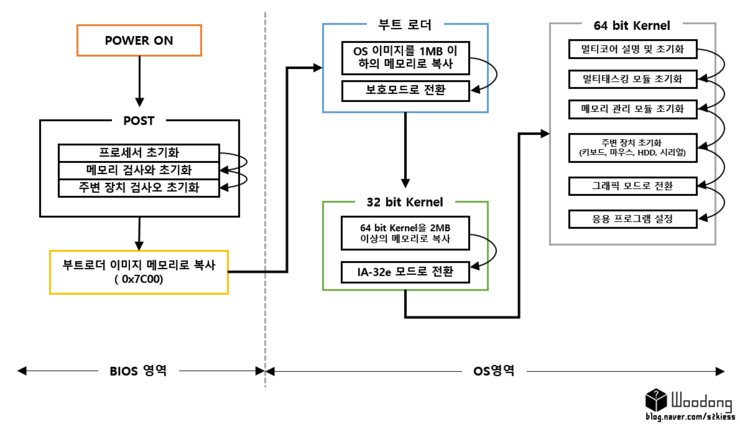 이 과정에서 프로세스 초기화, 메로리와 외부 디바이스 검사 및 초기화, 부트 로더 호출 및 OS 시작 등의 작업을 한다.
