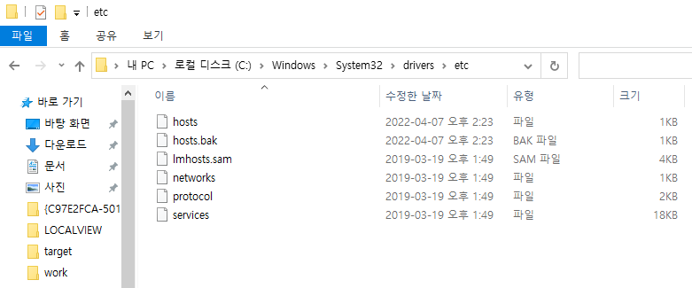 C:\Windows\System32\drivers\etc 폴더를 확인하면 위와 같이 파일을 확인할 수 있다.