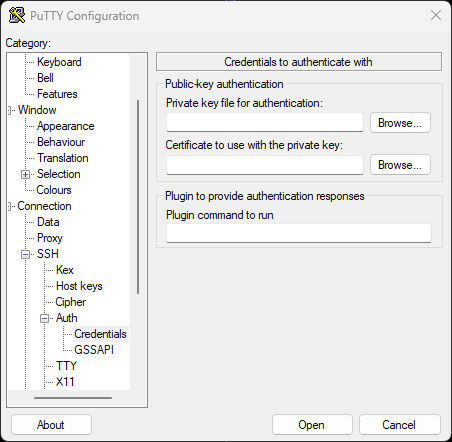 좌측 Connection > SSH > Auth > Credentials 메뉴를 클릭 실행한 후