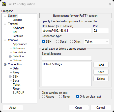 좌측 Session 메뉴를 클릭 실행한 후 Host Name 에 접속 정보를 입력한 후 하단의 Open 버튼을 클릭 실행한다.