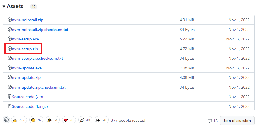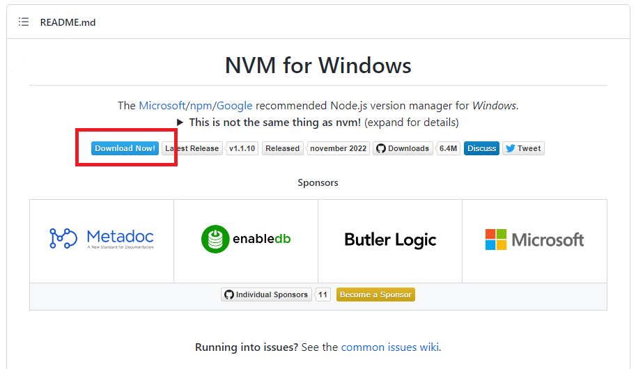 Windows 용 NVM 은 아래의 Github 페이지에서 다운로드 받는다.