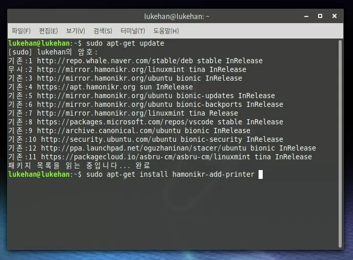 위의 스크린샷 처럼 sudo apt-get update 을 입력한 뒤 sudo apt-get install hamonikr-add-printer 를 입력하여 설치합니다.