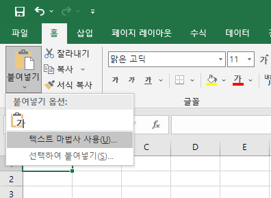 데이터를 추가할 엑셀 파일의 상단 "홈 > 붙여넣기 > 텍스트 마법사 사용" 을 클릭 실행합니다.