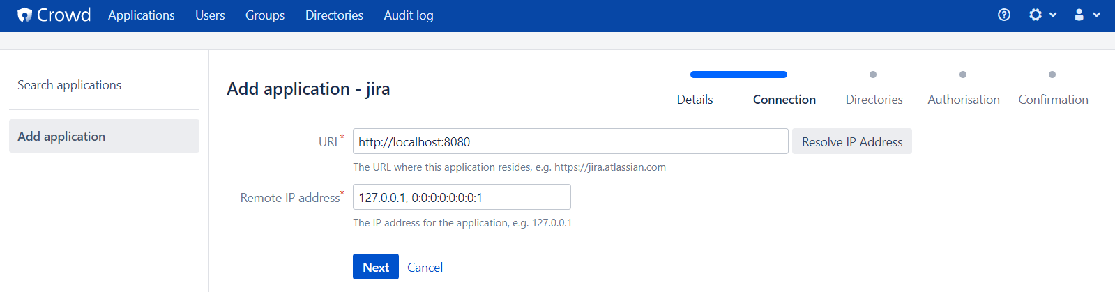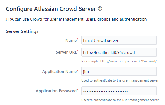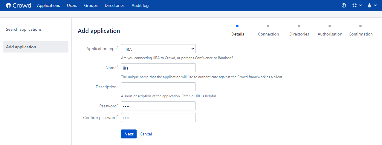 - Application type : Crowd 계정 관리를 적용할 서비스를 선택합니다. 해당 문서에서는 JIRA 를 선택하여 진행한다.