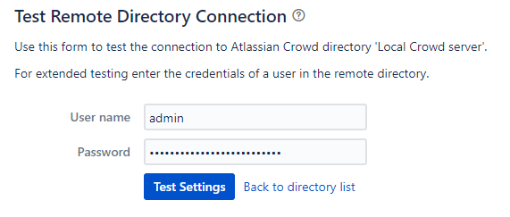 해당 페이지에서 Crowd 의 계정 정보 및 비밀번호를 입력한 후 하단 Test Settings 버튼을 클릭 실행하여 연결 상태를 확인할 수 있다.