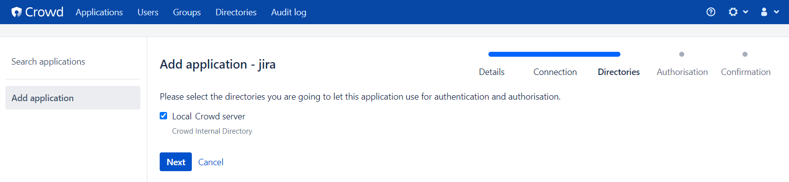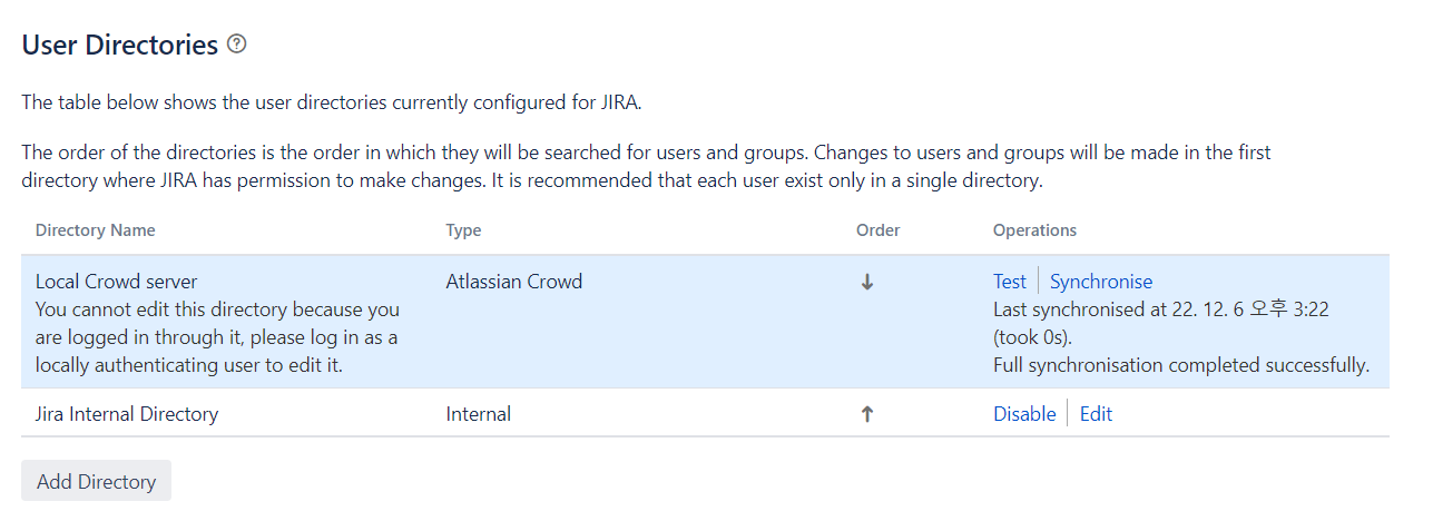 좌측 하단의 add Directory 버튼을 클릭 실행한 뒤 Directory Type 을 Atlassian Crowd 로 선택한 후 Next 버튼을 클릭 실행한다.