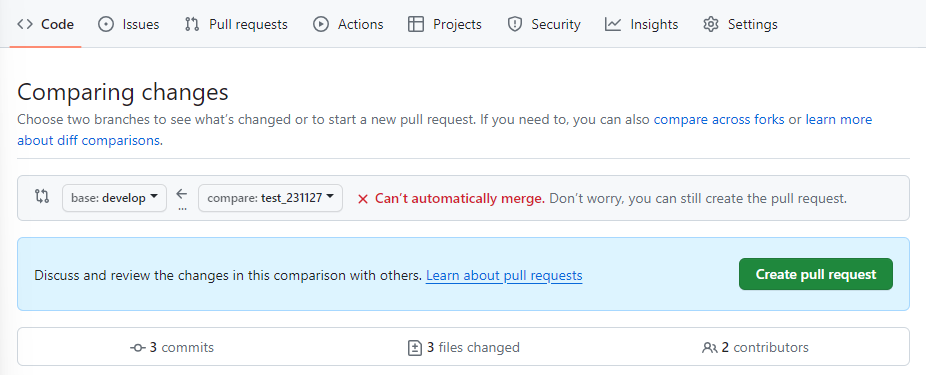 위와 같이 base 는 develop 으로, compare 는 test_231127 로 설정하면 Can't automatically merge 메시지가 나오는 것을 확인할 수 있다.