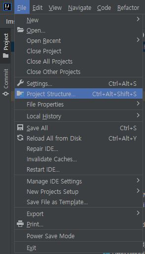 좌측 상단 'File > Project Structure' 메뉴 클릭 실행