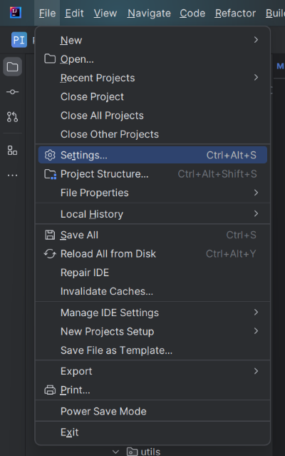 좌측 상단 File > Settings 메뉴를 클릭 실행합니다.