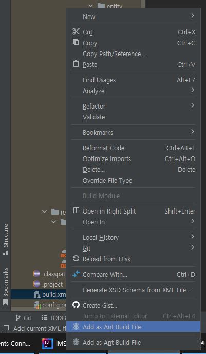 'build.xml' 파일을 우클릭 한 후 메뉴 하단의 'Add as Ant Build File' 을 클릭 실행한다.