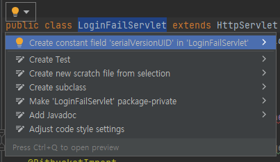 serialVersinoUID 를 생성할 클래스에서 위와 같이 추가할 수 있는 것을 확인할 수 있다.