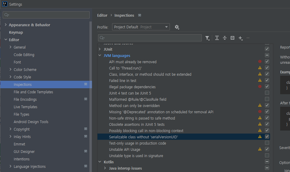 Settings 창 좌측 메뉴 Editor > inspections 를 클릭한 후 우측 목록에서 JVM languages > Serializable class without 'serialVersinoUID' 를 체크한 후 OK 버튼을 클릭 실행한다.