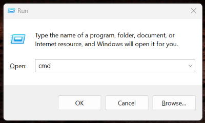 Windows + R 키를 입력하여 실행 창을 열고 cmd 를 입력한 후 확인 버튼을 클릭 실행합니다.