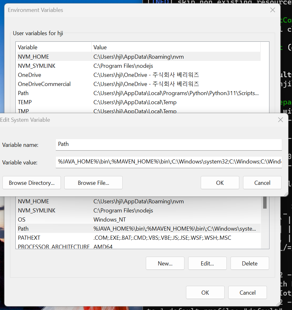 하단 변수 값에 ;%MAVEN_HOME%\bin\; 을 추가 입력한 후 확인 버튼을 클릭 실행합니다.