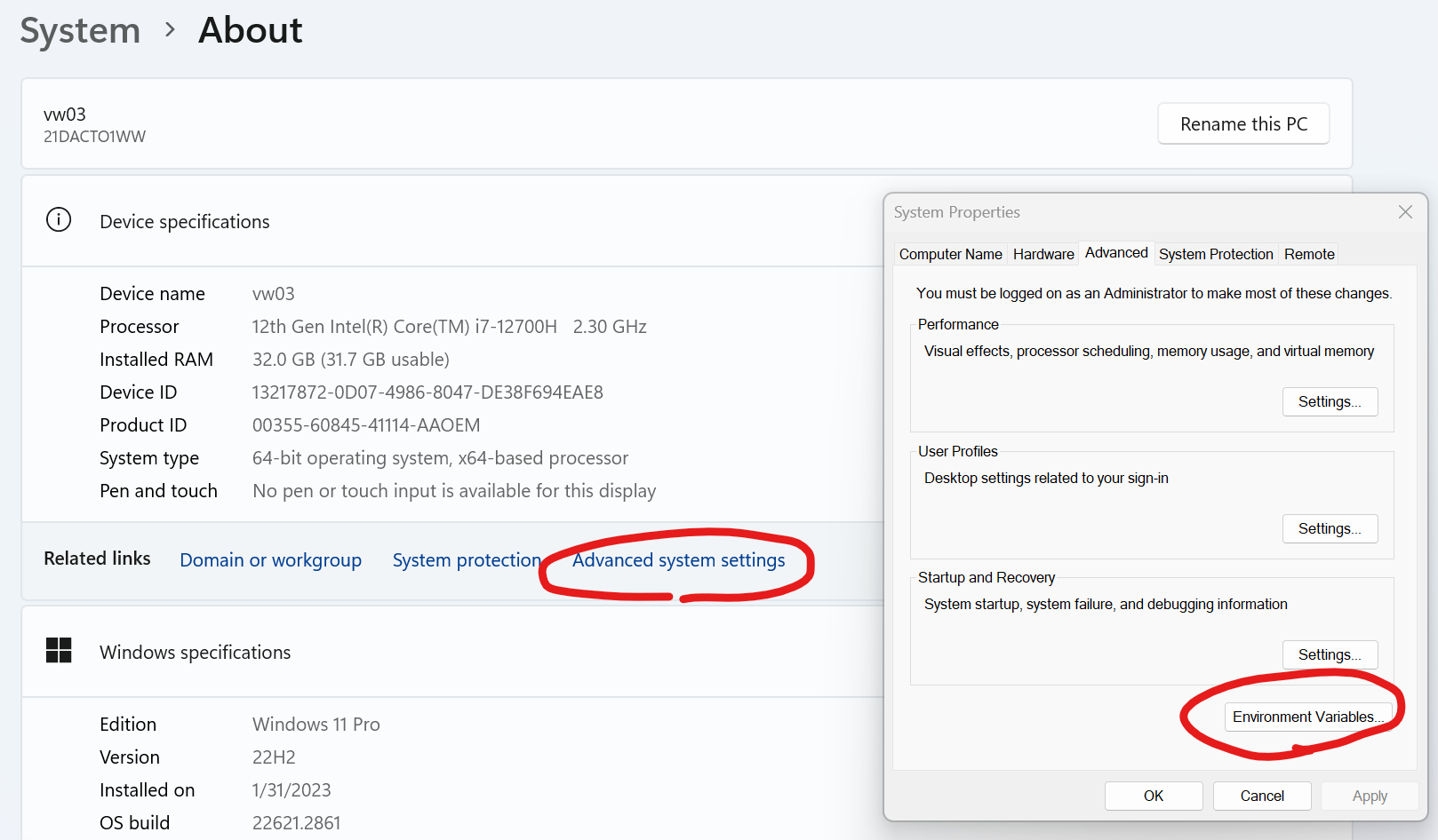 시스템 속성 창 상단 고급 탭 > 하단 환경 변수 버튼을 클릭 실행합니다.