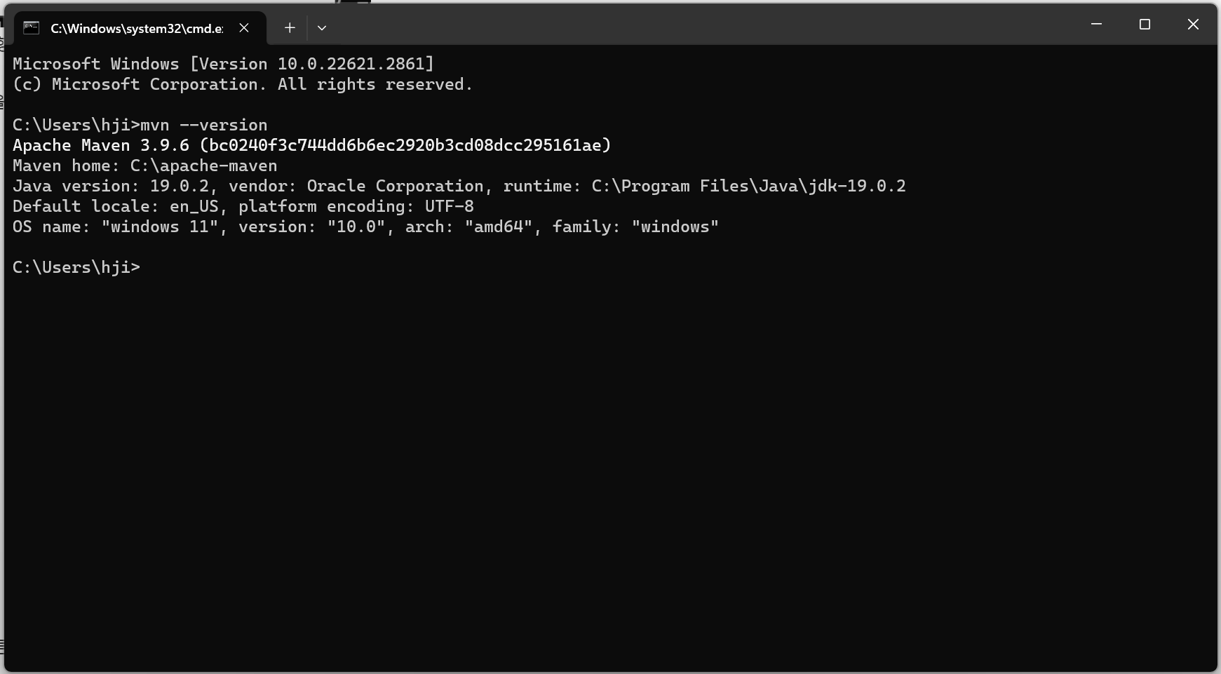 command 창이 나타나면 위와 같이 mvn --version 을 입력합니다.