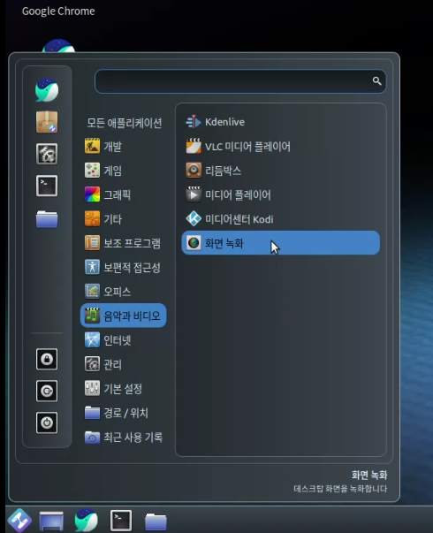 좌측 하단 '메뉴 > 음악과 비디오 > 화면 녹화' 실행