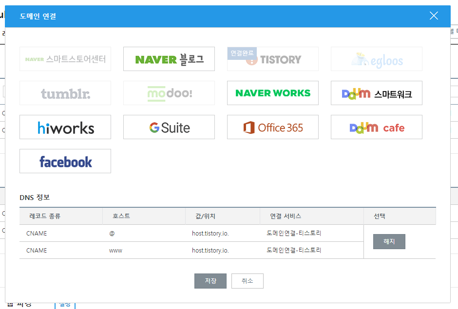 가비아에서는 손쉬운 도메인 연결을 지원합니다. 목록에서 Tistory를 선택하여 도메인 연결합니다.