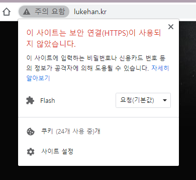 브라우저 주소창 좌측에 주의 요함 표기를 확인할 수 있습니다.