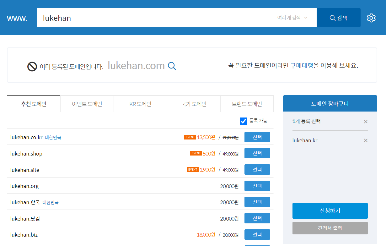 사용가능한 도메인 및 금액을 확인한 뒤 사용할 도메인의 선택 버튼을 클릭하여 도메인 장바구니에 추가합니다.