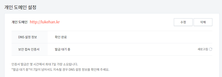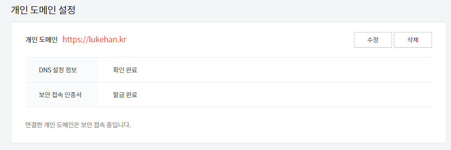 개인 도메인 설정에서 가비아에서 구매한 도메인 주소를 입력하여 등록합니다.