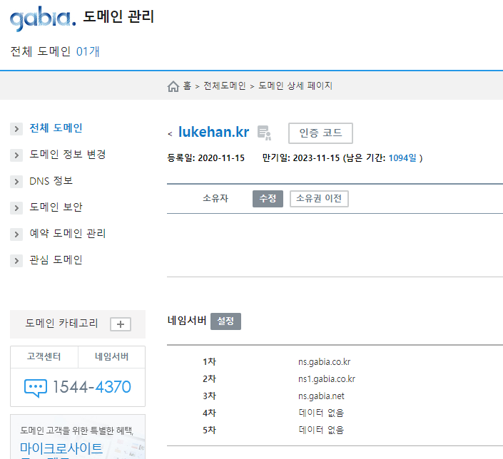 가비아 관리 페이지에서 해당 도메인 상세 정보를 확인해 보면 인증코드를 확인할 수 있습니다.