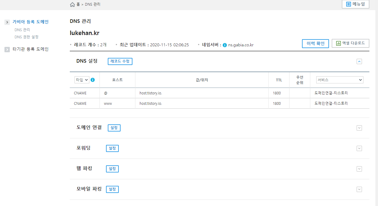 티스토리에서 도메인 연결 설정을 진행합니다.