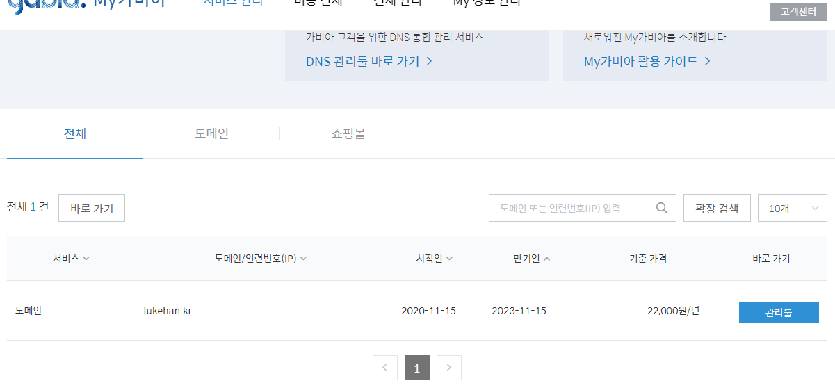 페이지 하단에서 구매한 도메인 정보를 확인할 수 있습니다.