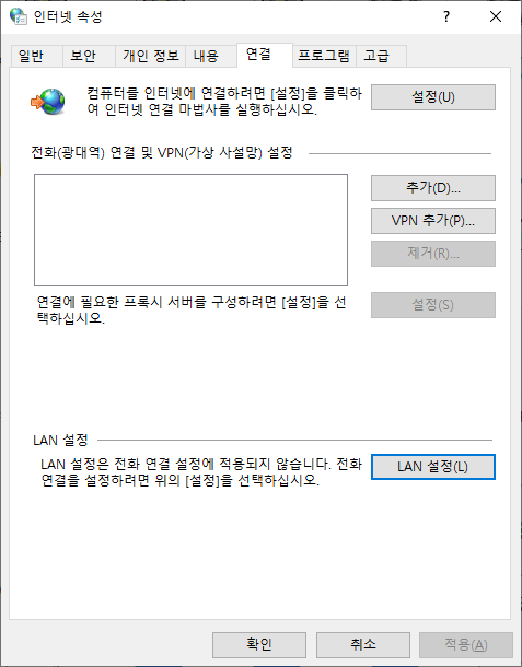 연결 탭 하단의 'LAN 설정' 버튼을 클릭 실행한다.