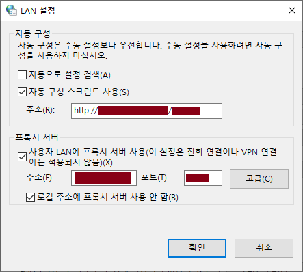 LAN 설정 창에서 위와 같이 Proxy 설정 정보를 확인할 수 있다.
