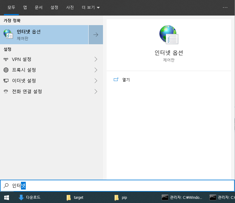 '윈도우 검색 창' 에서 '인터넷 옵션'을 찾아서 실행한다.