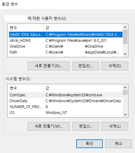 환경 변수 정보를 추가 하거나 편집 합니다.
