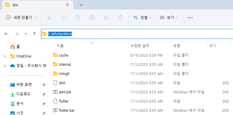 압축 해제 후 flutter\bin 폴더로 이동한 후 위와 같이 경로를 복사한다.