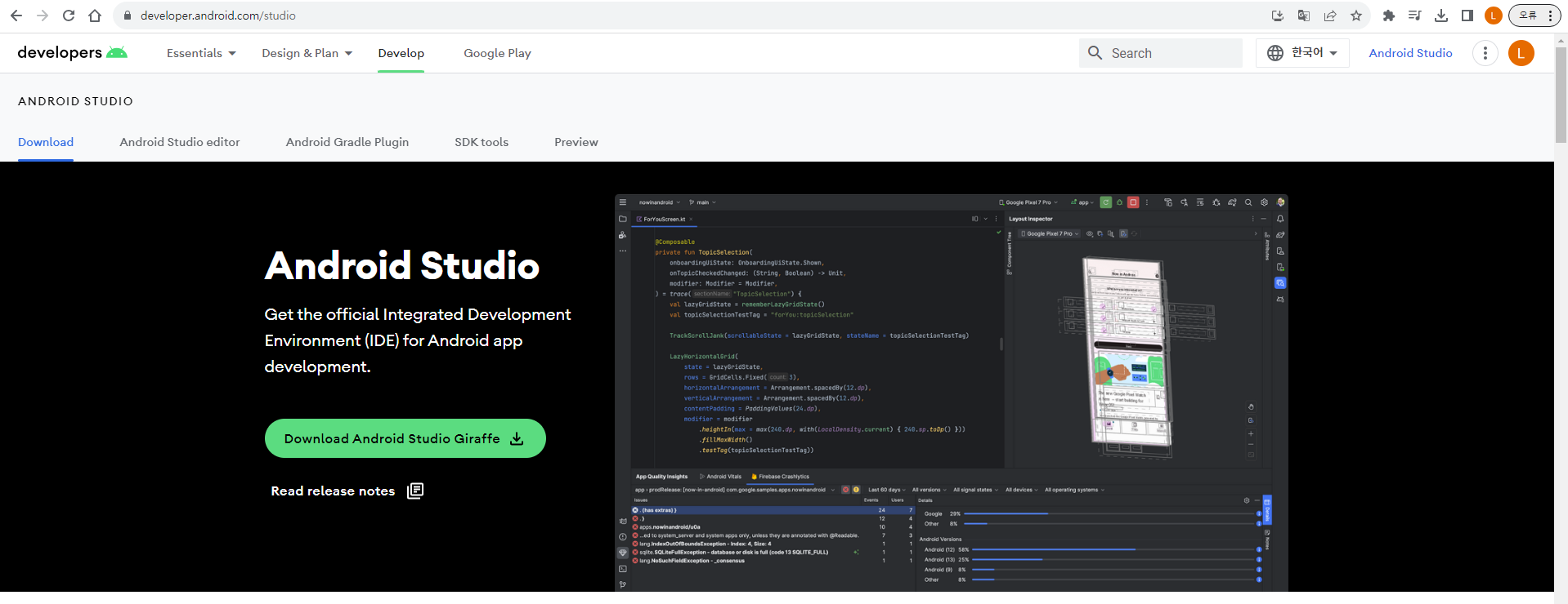 화면에 있는 Download Android Studio Giraffe 를 클릭 실행한 후 설치 파일을 다운로드 한다.