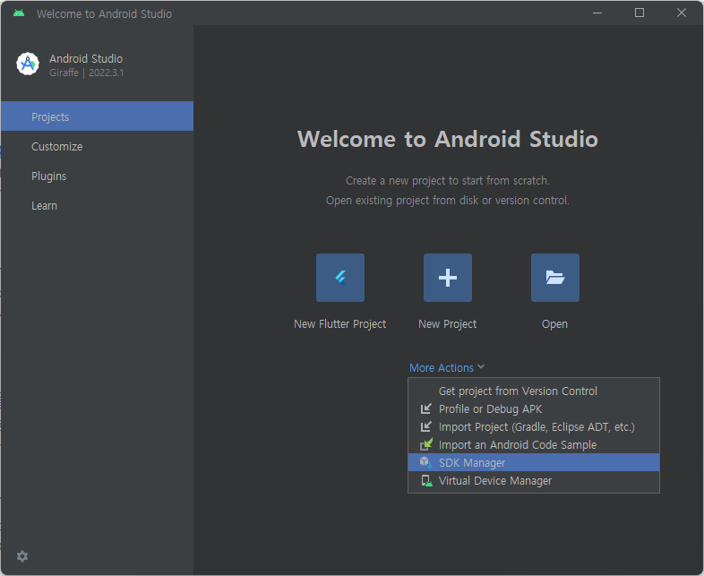 설치가 완료되면 좌측 메뉴 상단의 Projects 를 클릭 선택한 후 하단의 More Actions > SDK Manager 를 클릭 실행한다.