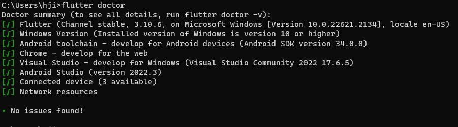 cmd 창이 나타나면 flutter doctor 를 입력하여 환경 구성 상태를 확인한다.