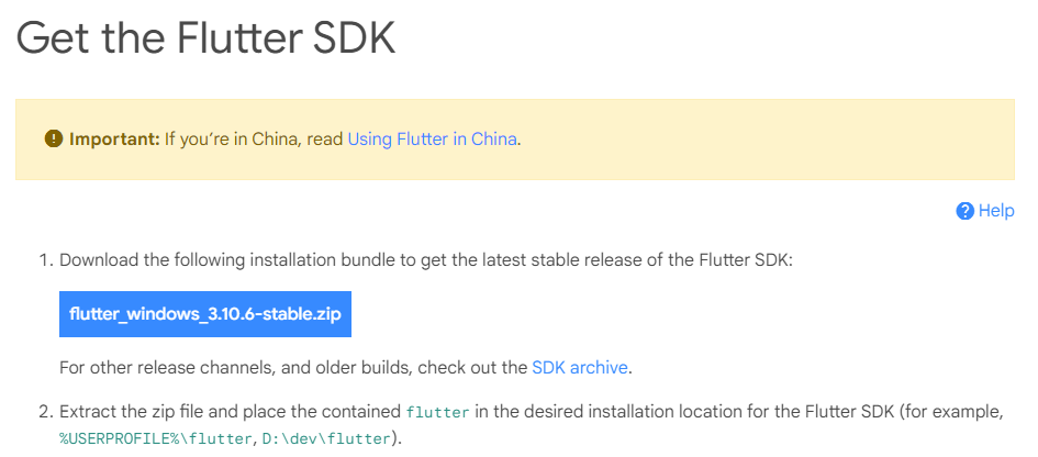 Get the Flutter SDK 항목에서 flutter_windows_3.10.6-stable.zip 버튼을 확인할 수 있다.