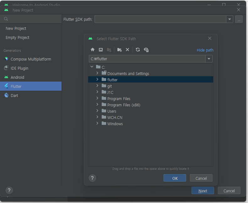 경로는 다운로드하여 설치한 Flutter 경로를 설정한 후 하단의 Next 버튼을 클릭 실행한다.