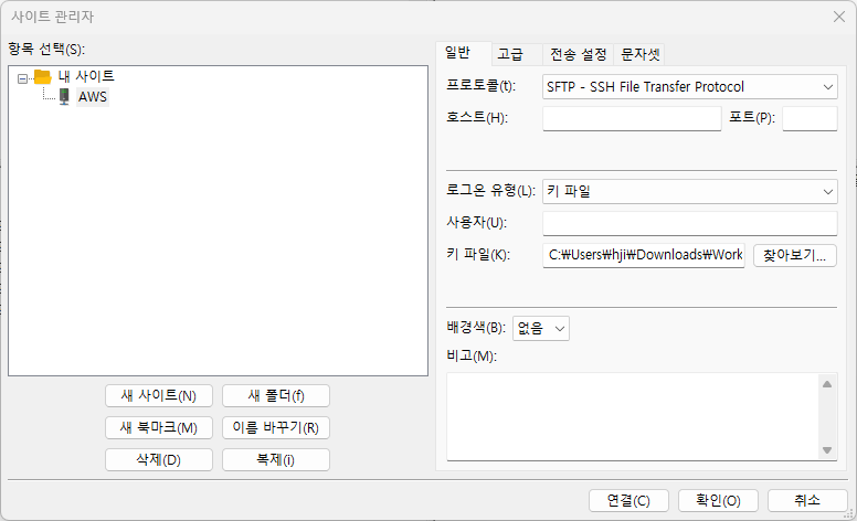 새 사이트를 클릭 실행한 후 우측에서 프로토콜을 SFTP 로 선택 변경한 후 서버 정보를 입력한다