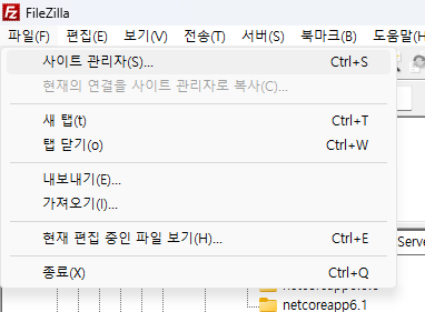 FileZilla 의 좌측 상단 파일 > 사이트 관리자 메뉴를 클릭 실행한다